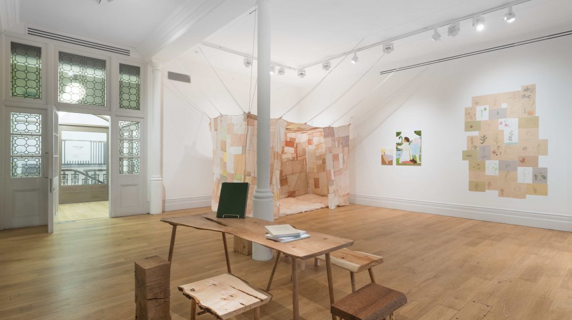 A place to sit, pause and read has been carved out of reclaimed and salvaged wood using inherited tools and skills passed down from the artist’s late grandad. The various woods feature all the knots, textures, holes and grooves of their respective journeys