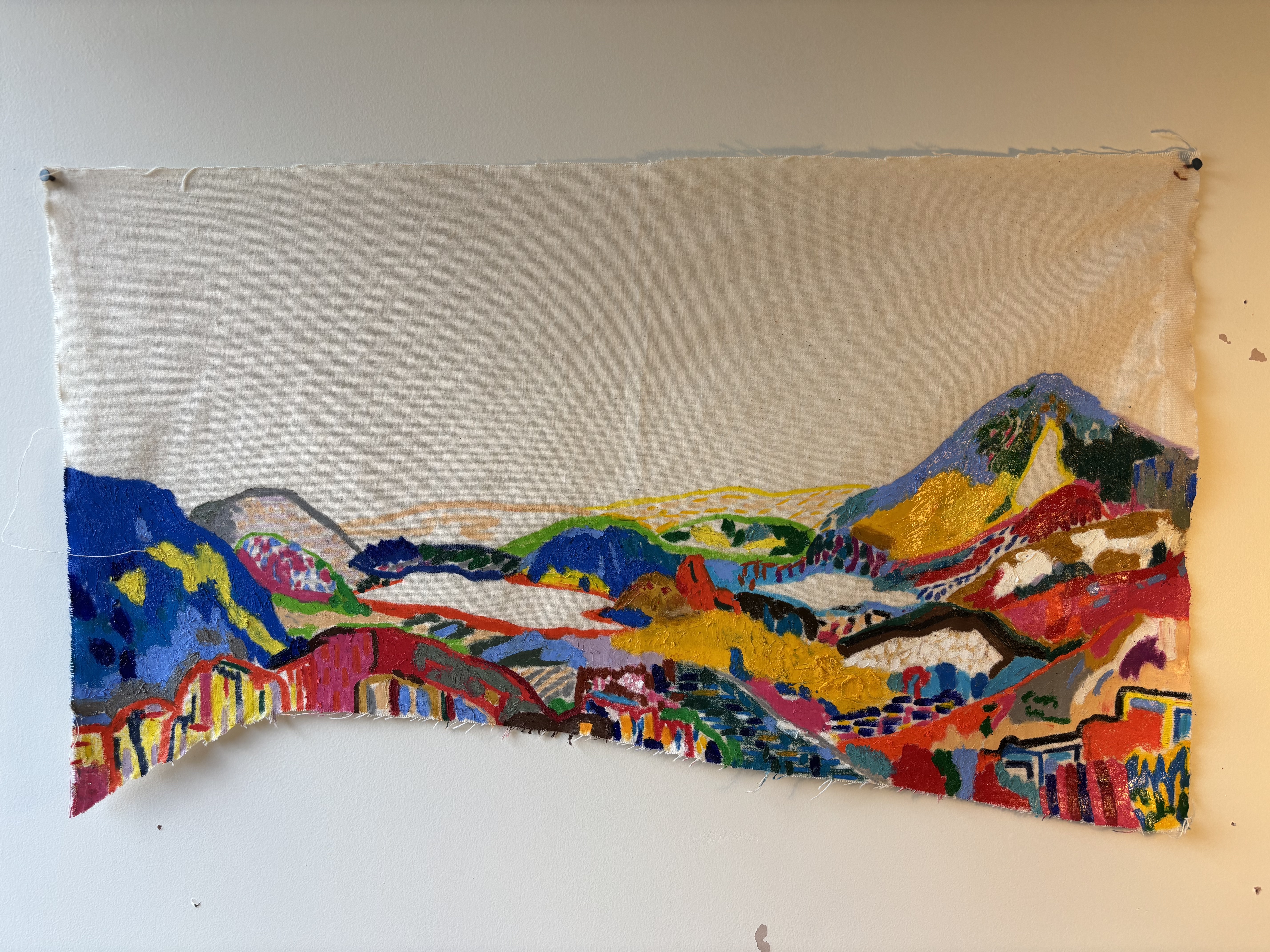 The term 'Fell' is Cumbrian dialect for the expanses of high, uncultivated, common grazing land where I grew up. The 'Fells' are embedded in my memory and though I don't look at them daily (as I no longer live in that part of the country), I continue to carry their shapes and textures with me. The imagined landscapes depicted are conjured up from a variety of sources, art historical references, social media, books and magazines. The resulting works are of no specific place in particular but being informed by lots of places act as an invitation for the viewer to recall their own loved landscapes, real or imagined. Colours are informed by record sleeves, art historical paintings, social media and fashion. Due to a colour deficiency I see colour differently to most, with vibrant contrasts being easier for me to see, focusing on texture alongside colour as well as disrupting bombastic human proclamations of 'capturing nature'.