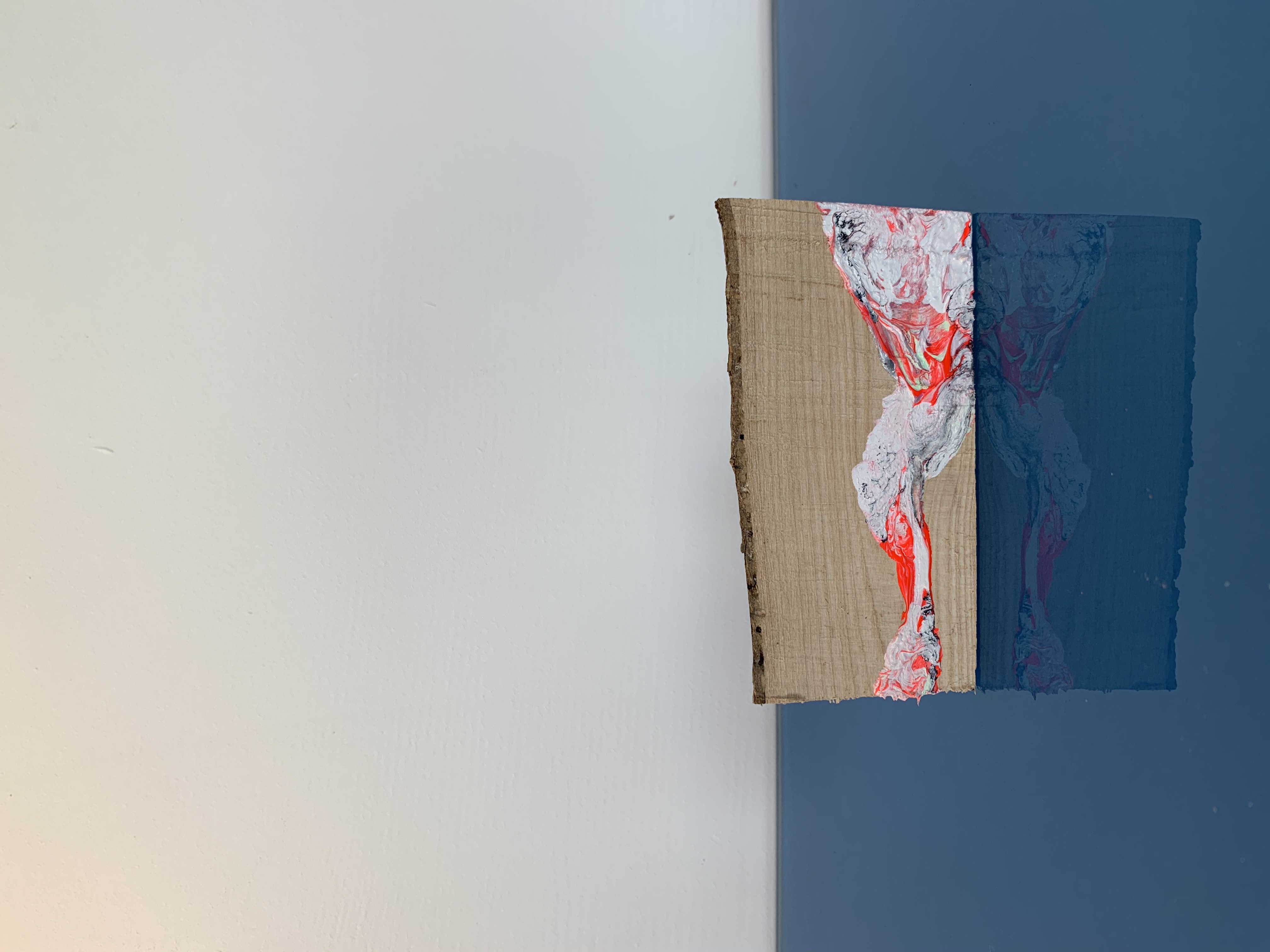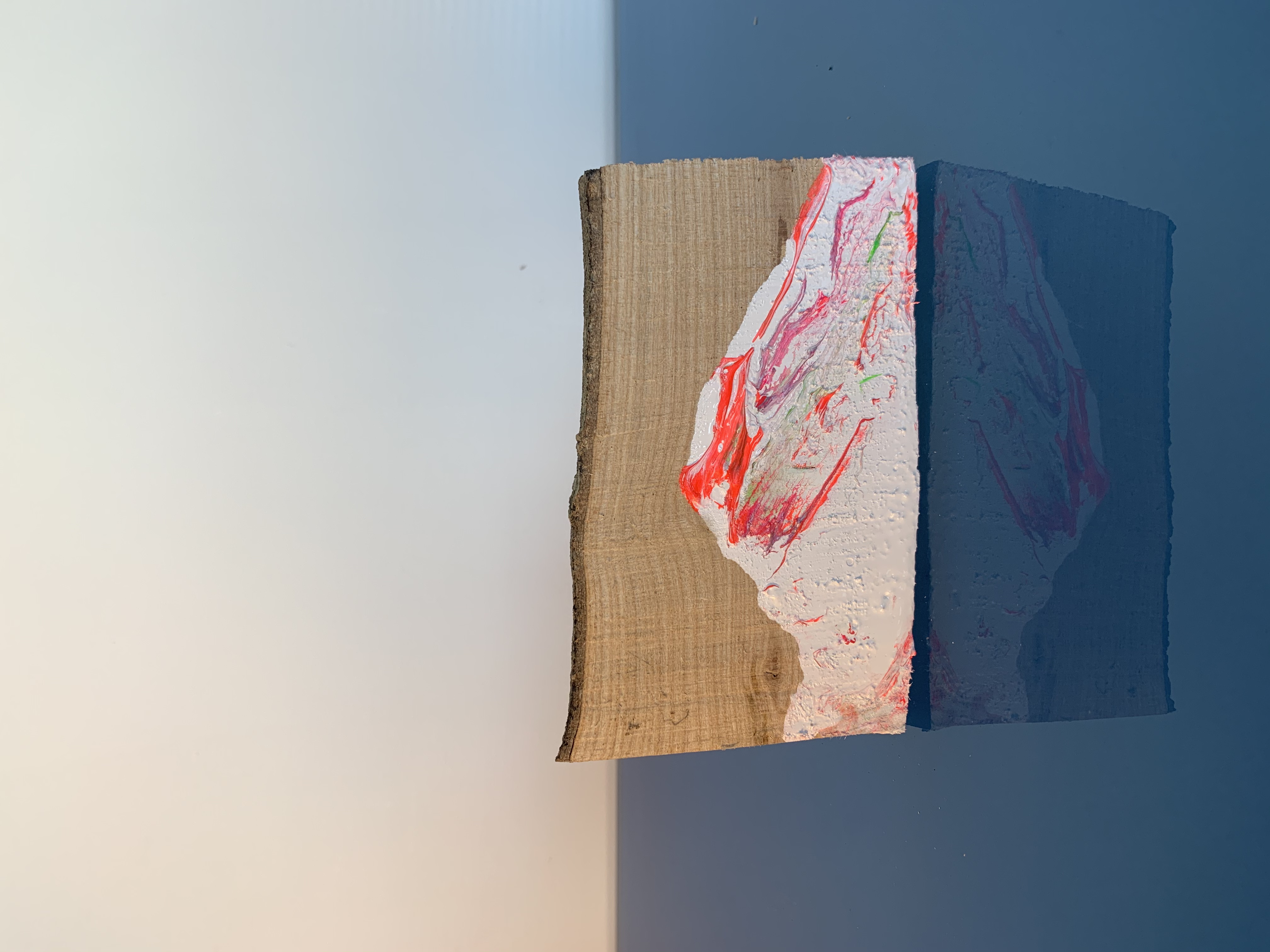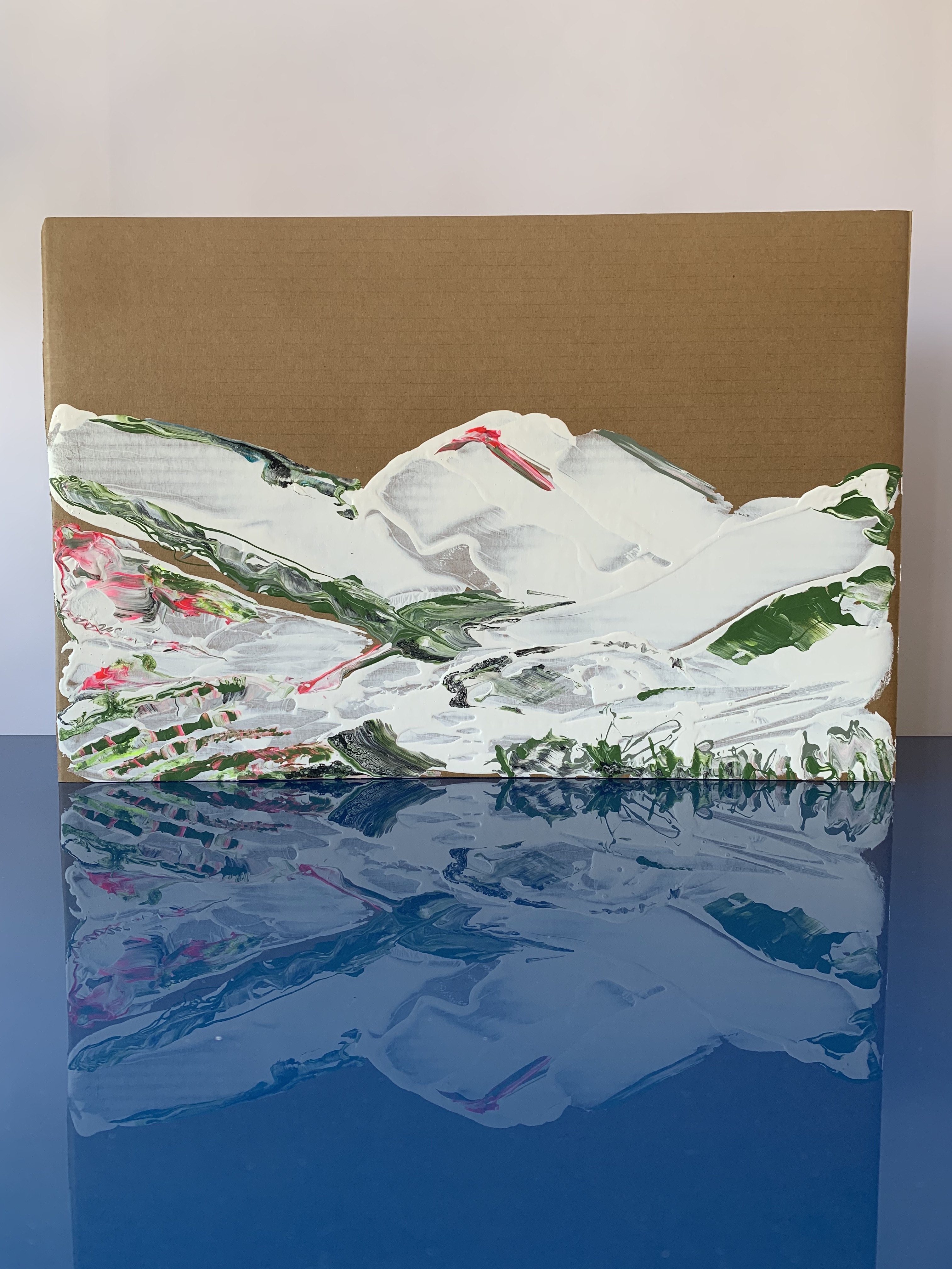 They are of no particular view, they could be of any imagined or real landscape and act as an invitation for the viewer to recall forgoten landscapes in their mind. Painted in a unique gloss paint and acrylic technique resulting in highly textural works on a host of found and reclaimed materials, wood and cardboard packaging. Ranging in size from A5 to 4ft square.