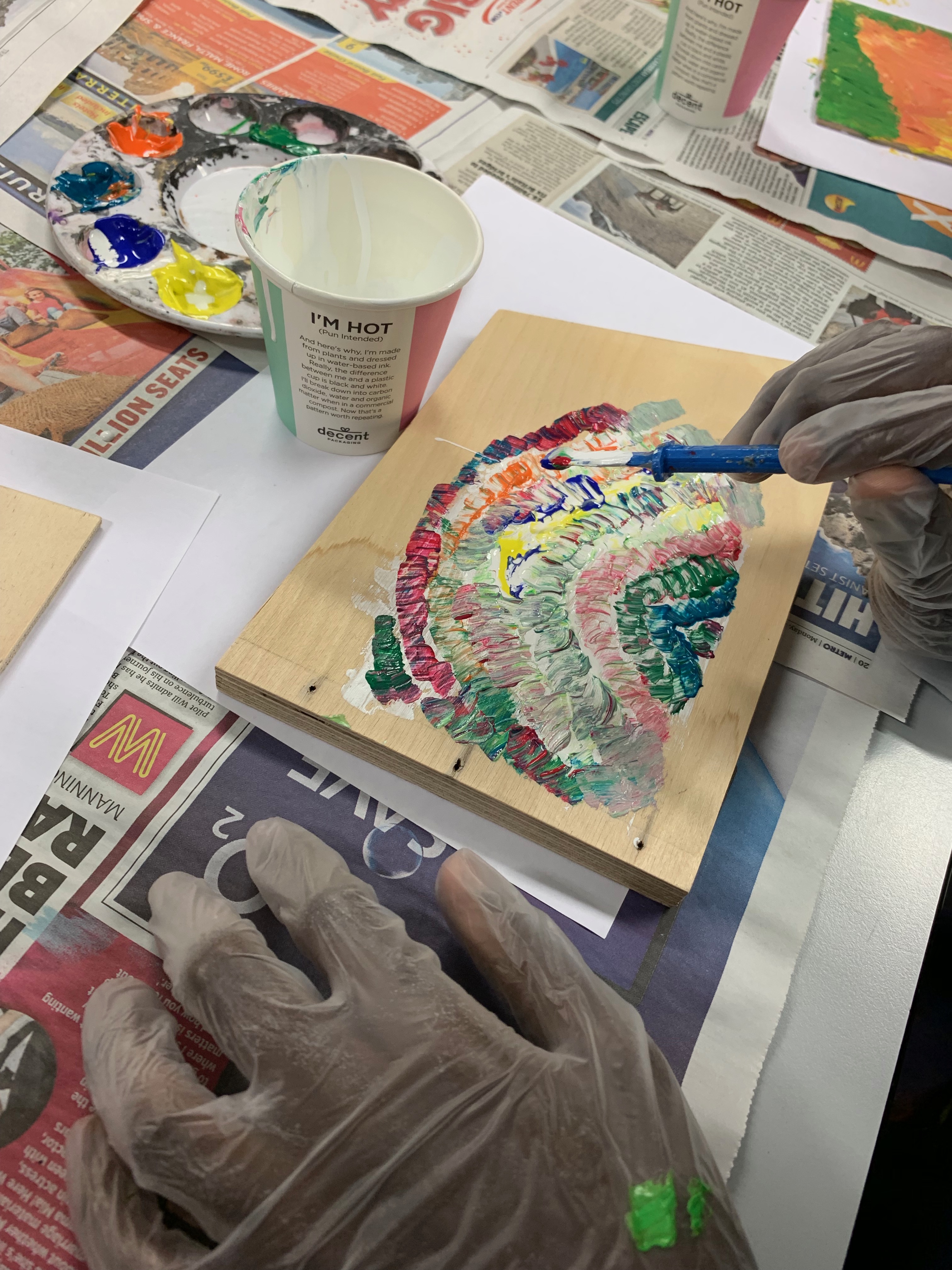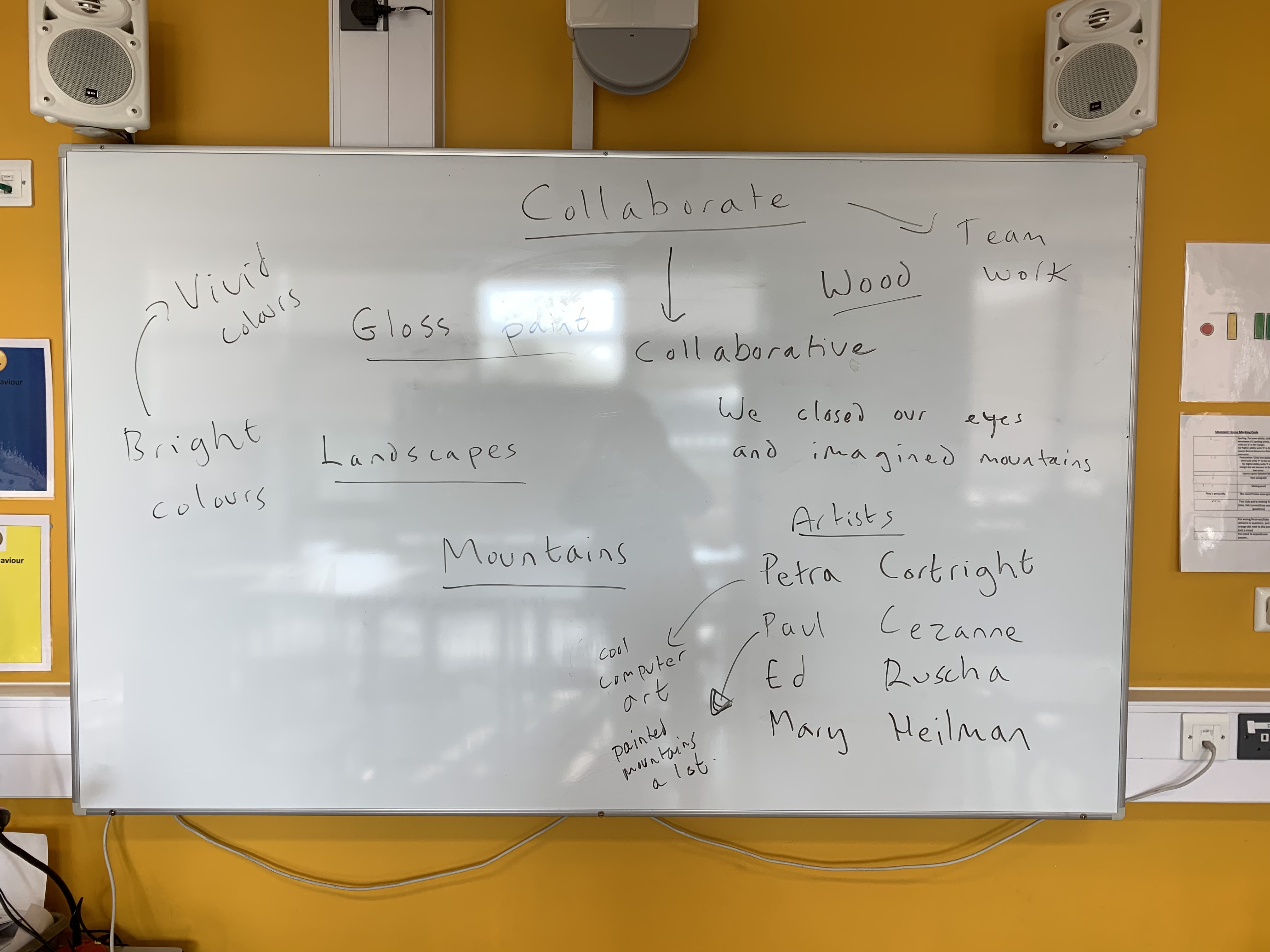 A project over 12 weeks exploring collaboration, contemporay art history and meditation. Each session began with a short meditation with students imagining a landscape and reflecting on what they could see, feel, smell, hear and touch in their mind’s eye. These reflections where then turned into works informed by contemporary artists with students exploring a range of techniques from Impressionist colour theories to digital painting. The project culminated with new works on found wood using expanded painting techniques and when displayed create an every-changing collaborative landscape in the school corridors.