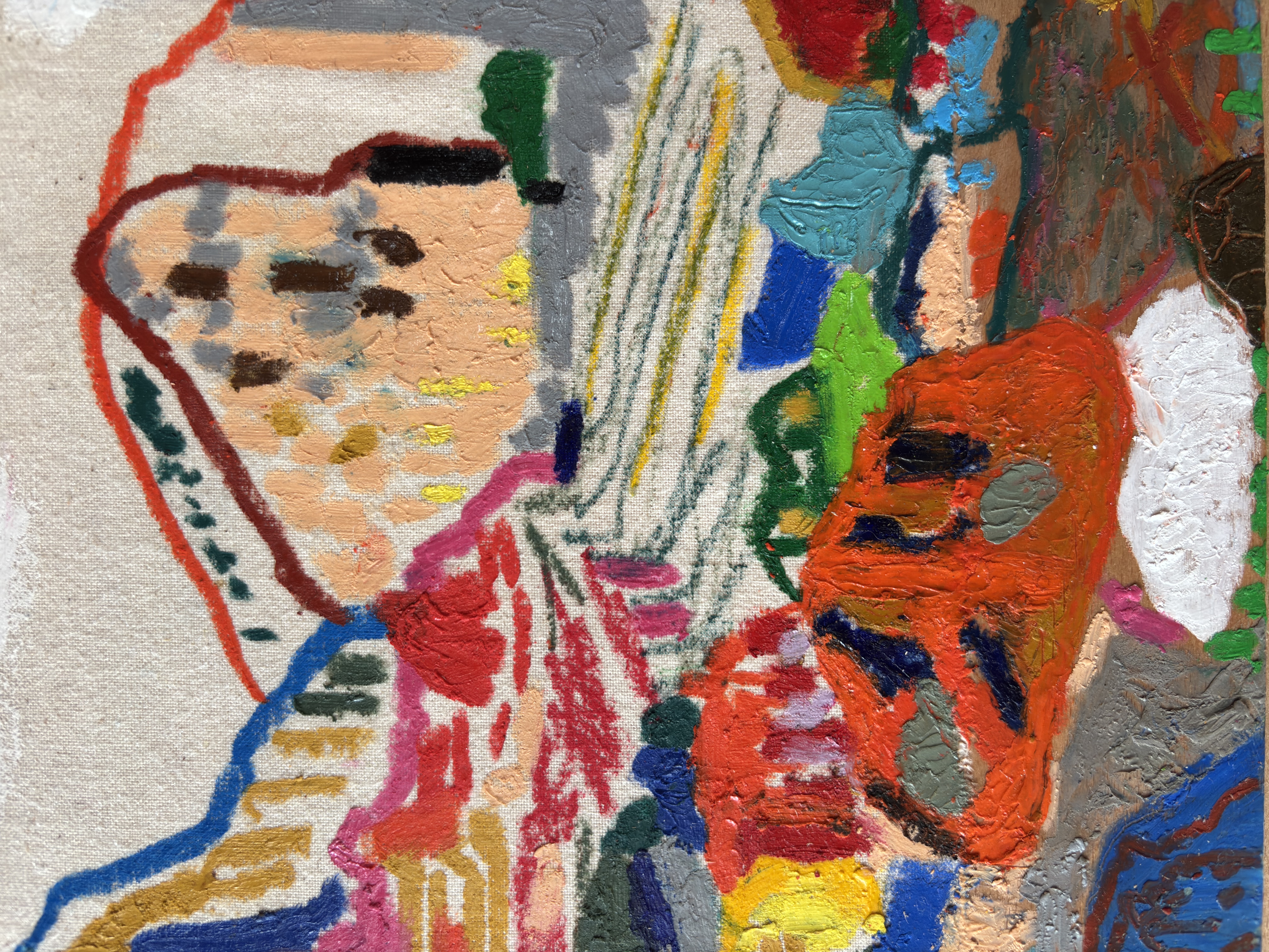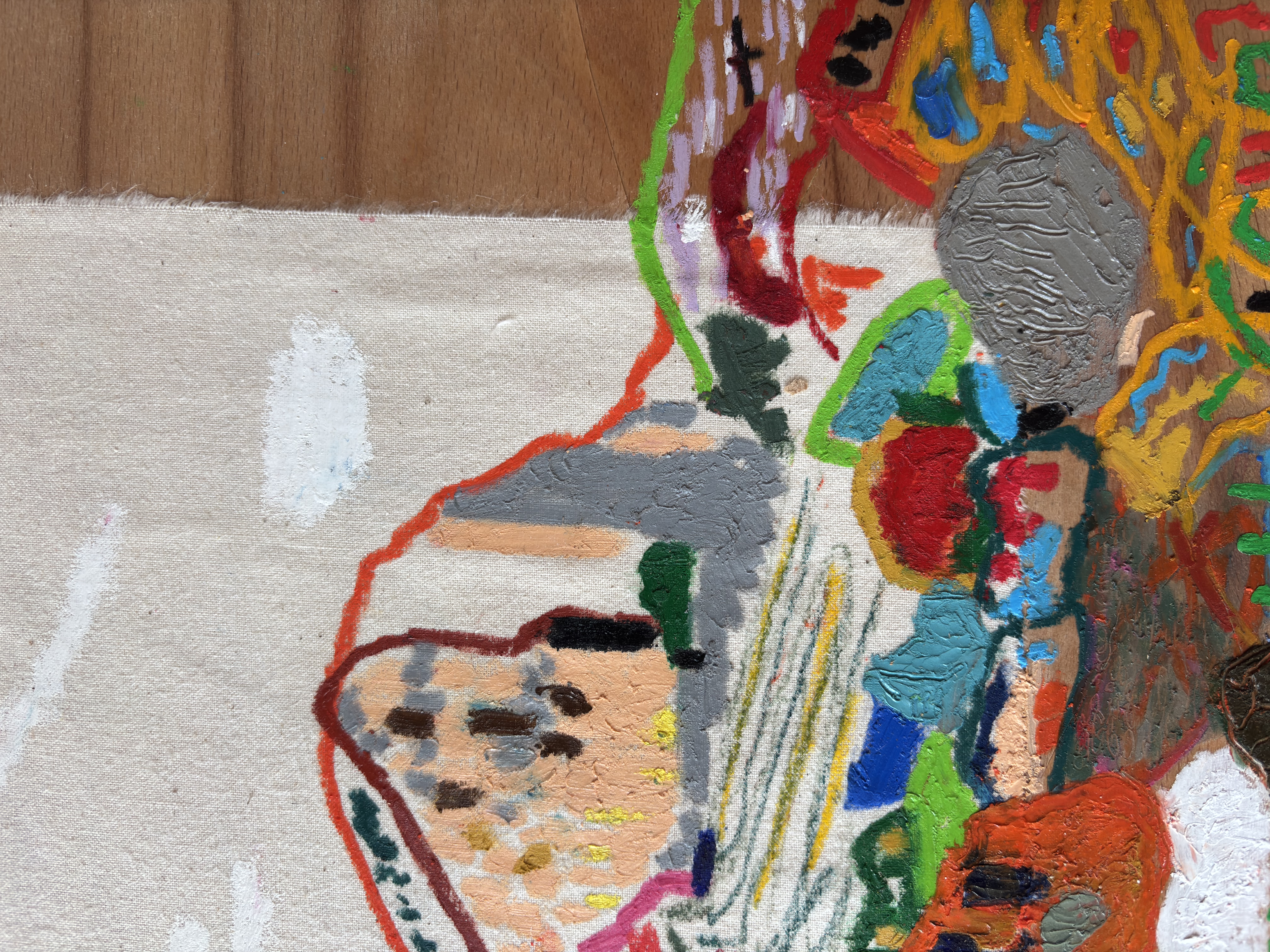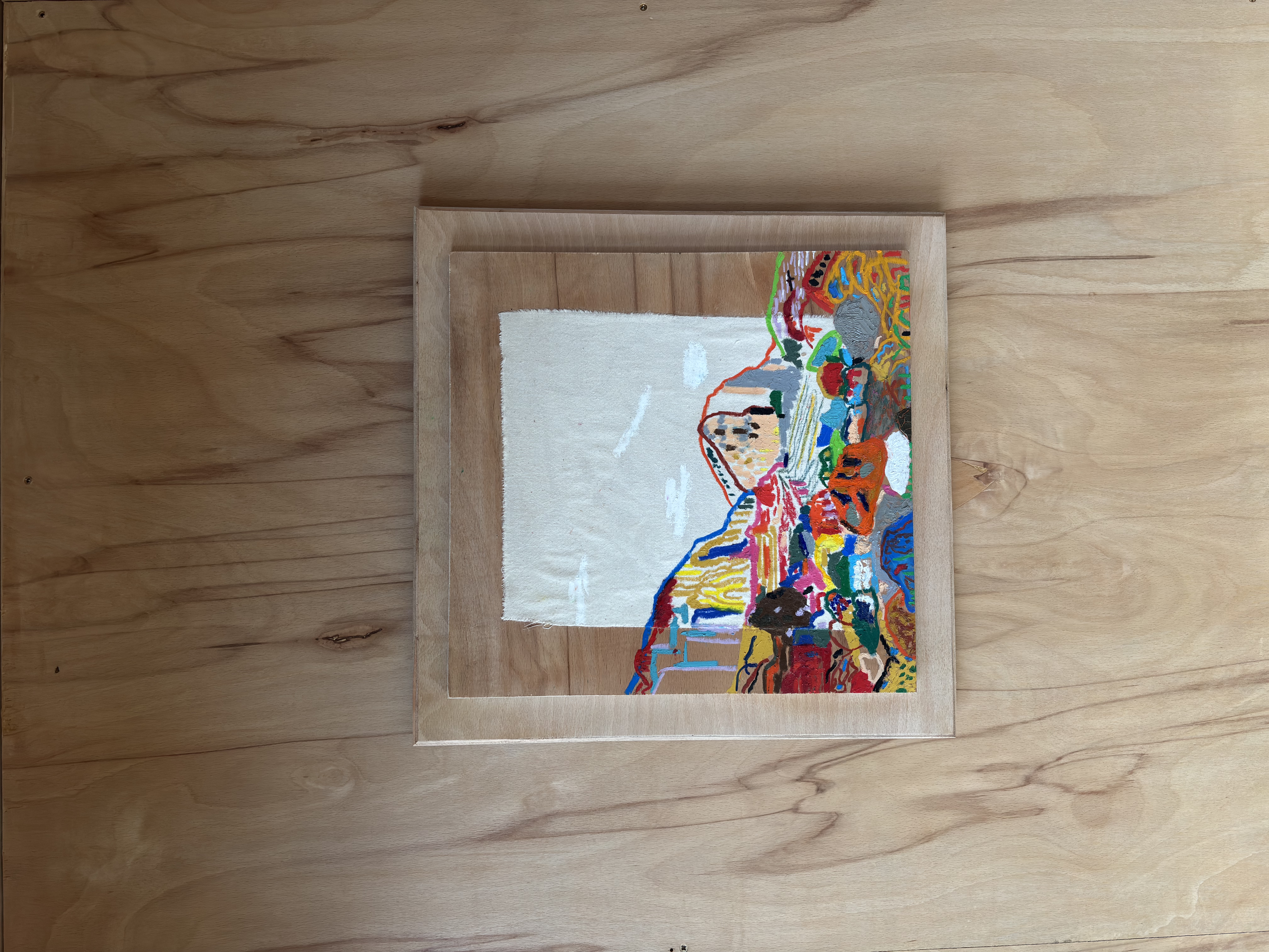 oil pastel, oil paint on calico on plywood