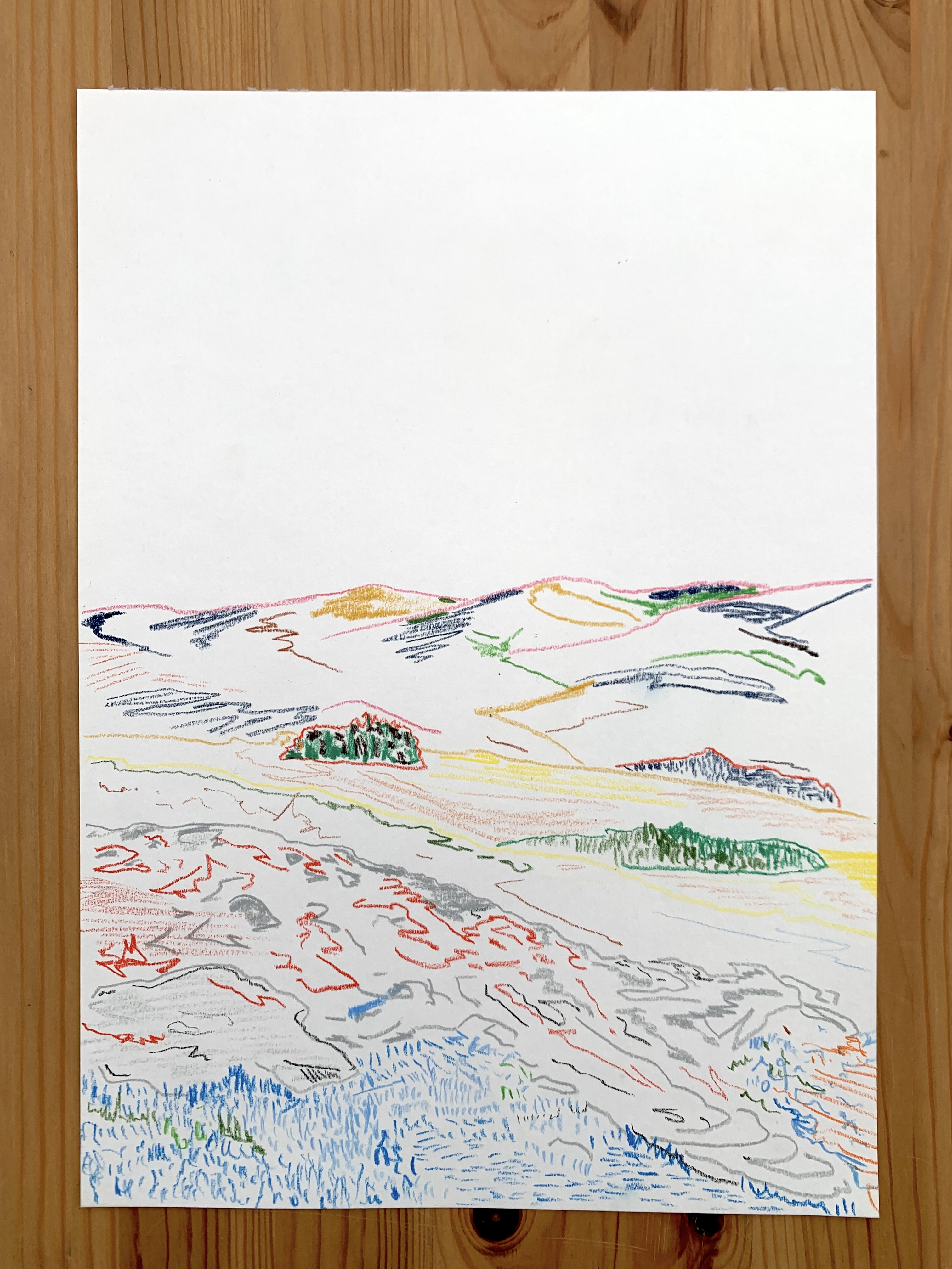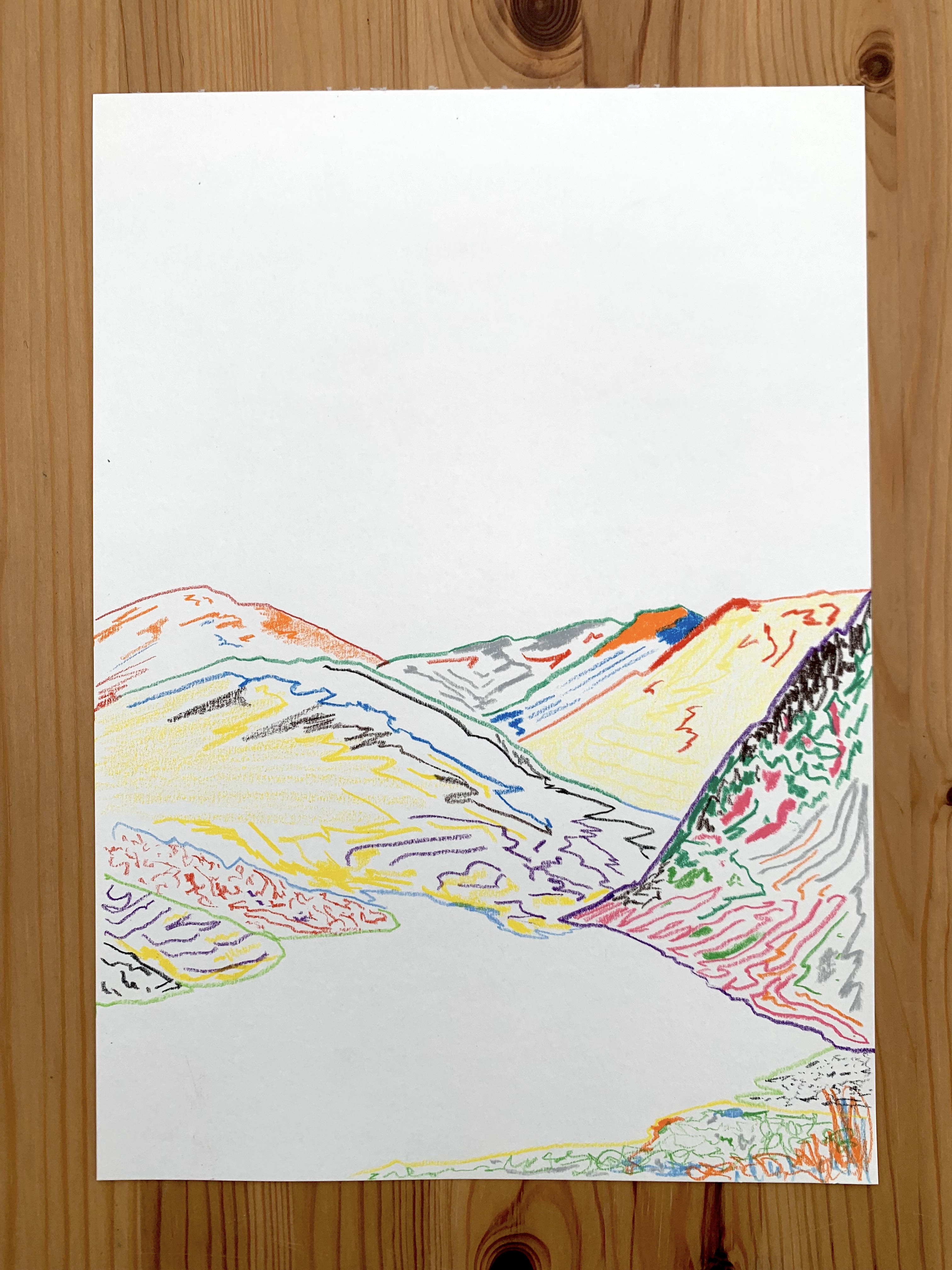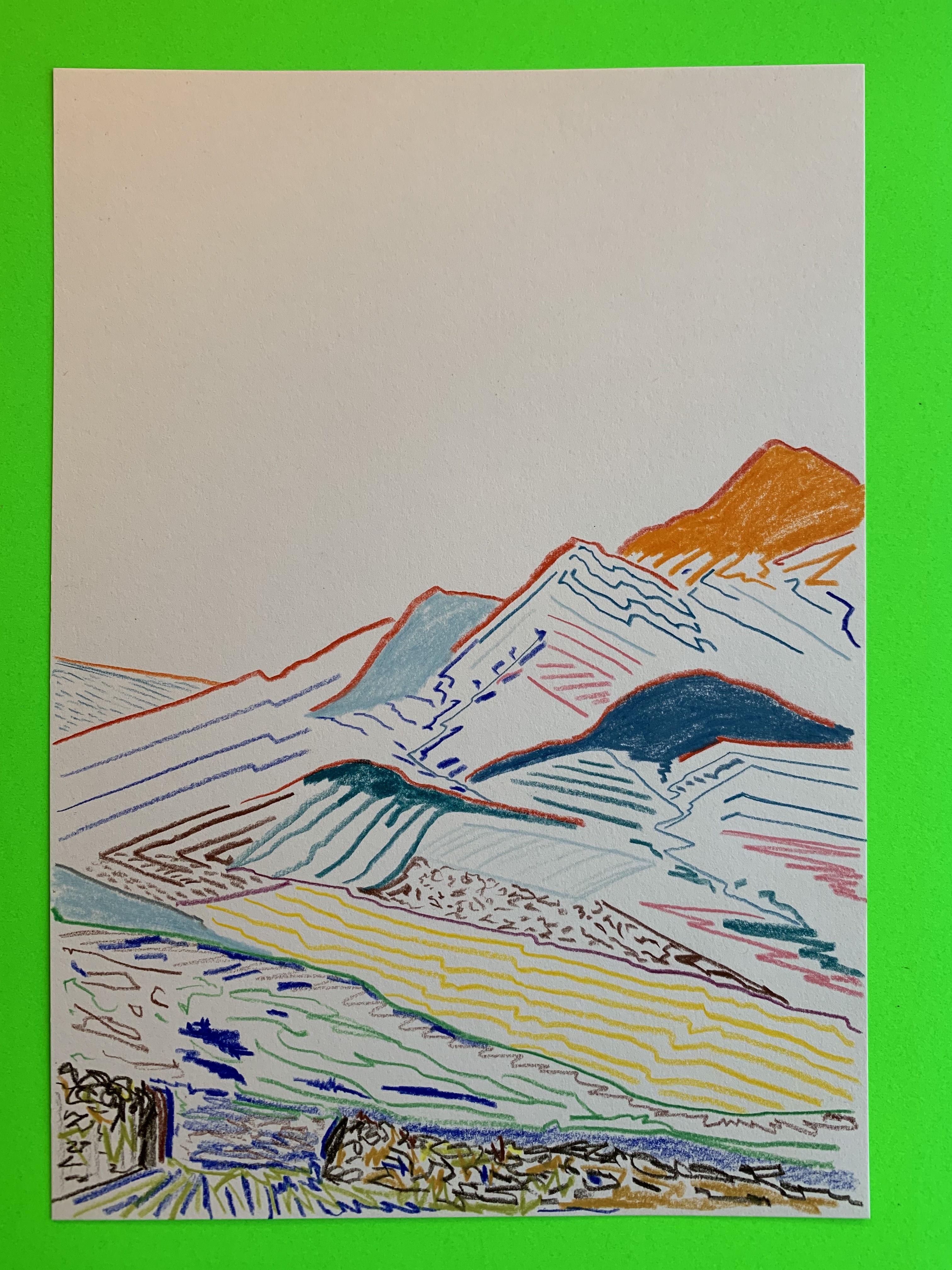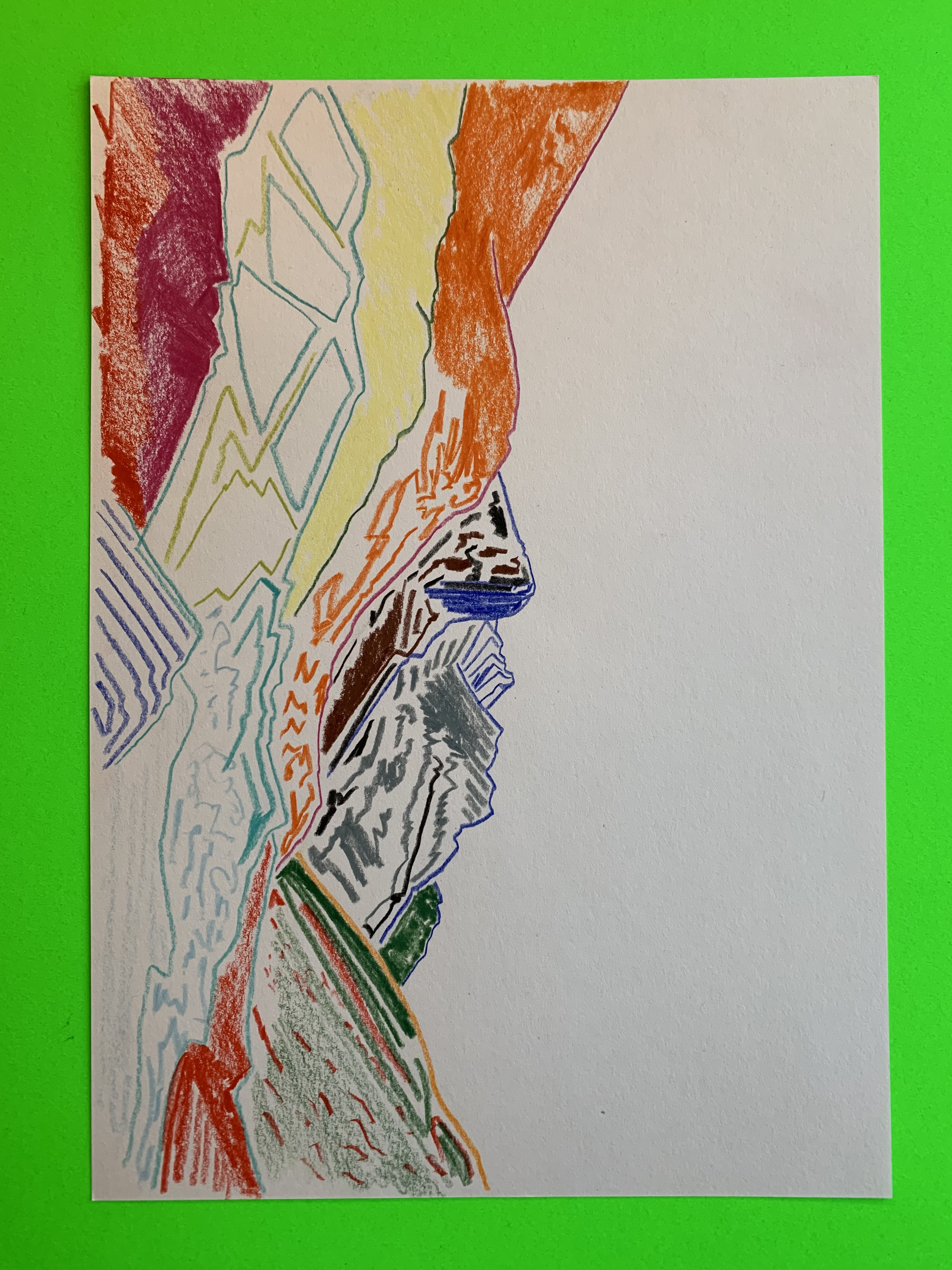 A4 drawings on paper in coloured pencils made whilst on Zoom meetings, workshops and discussions.