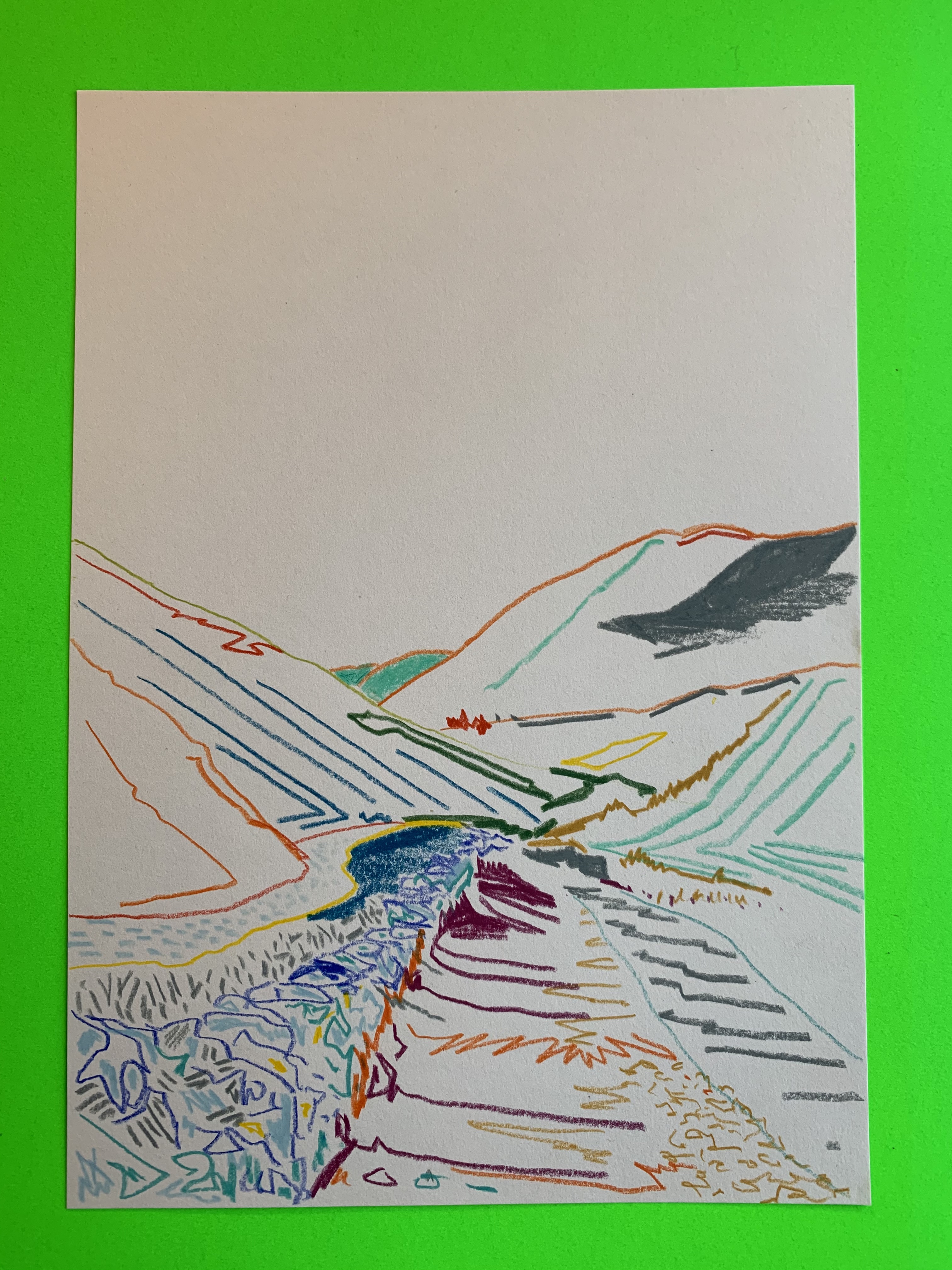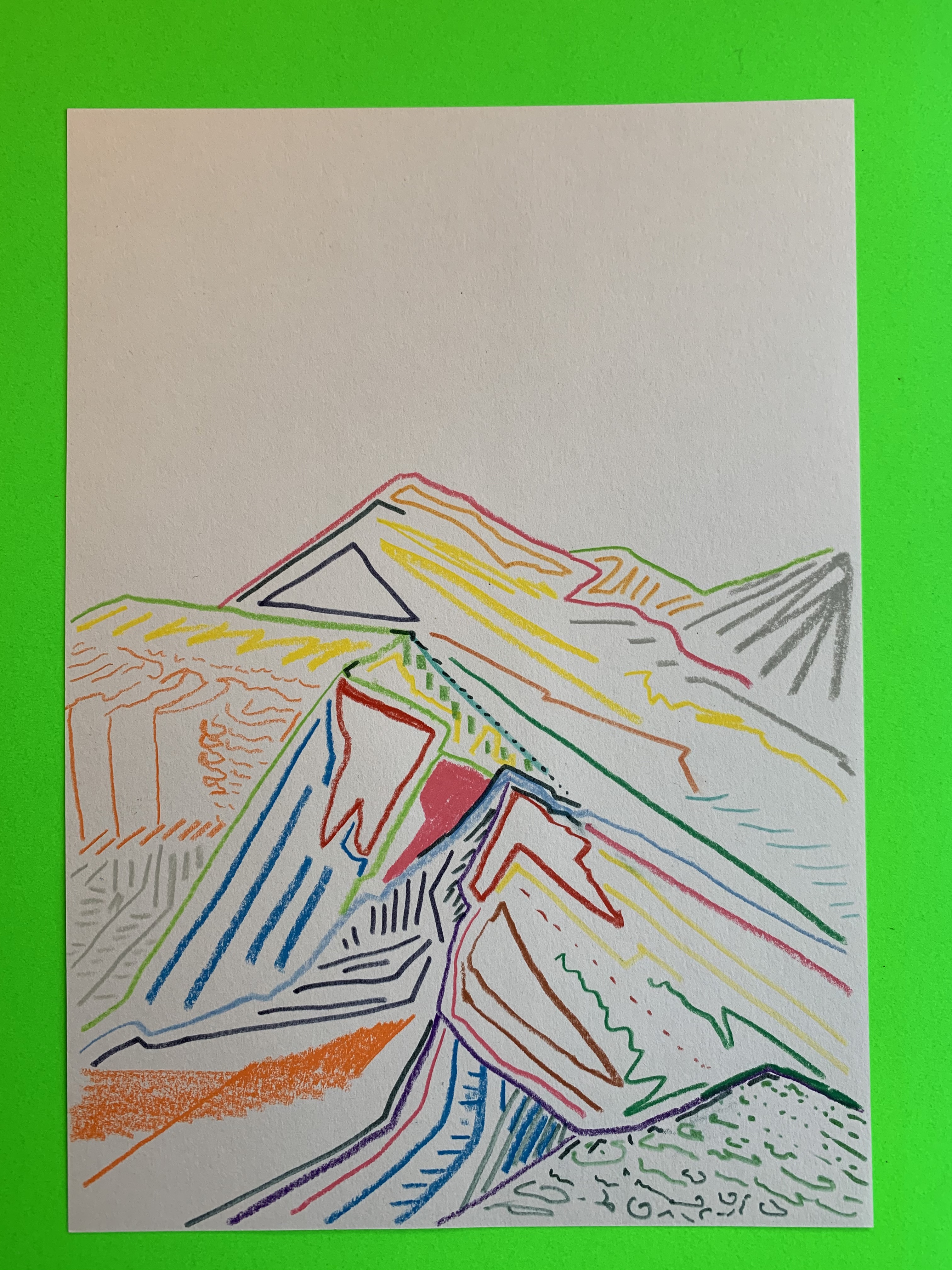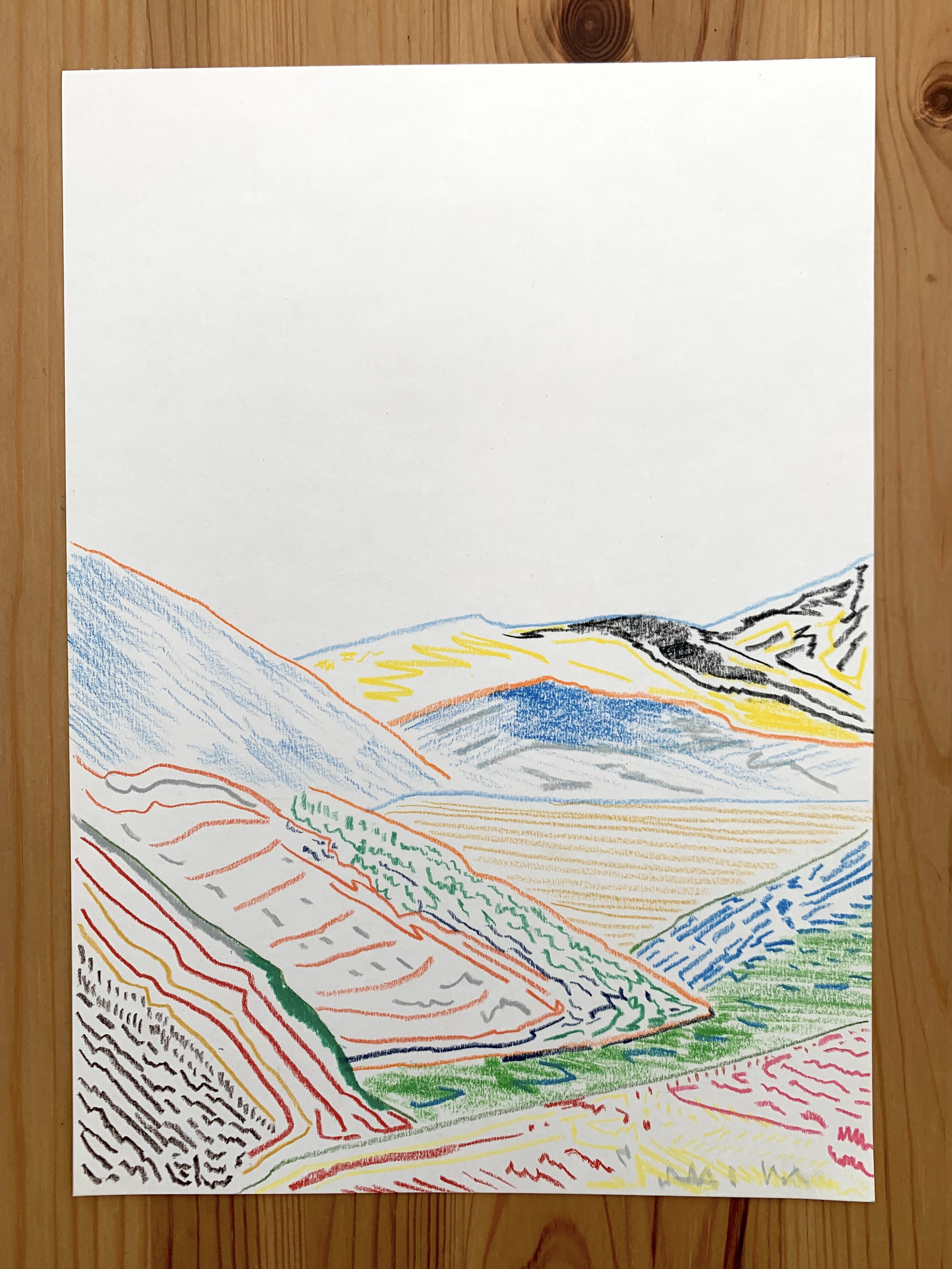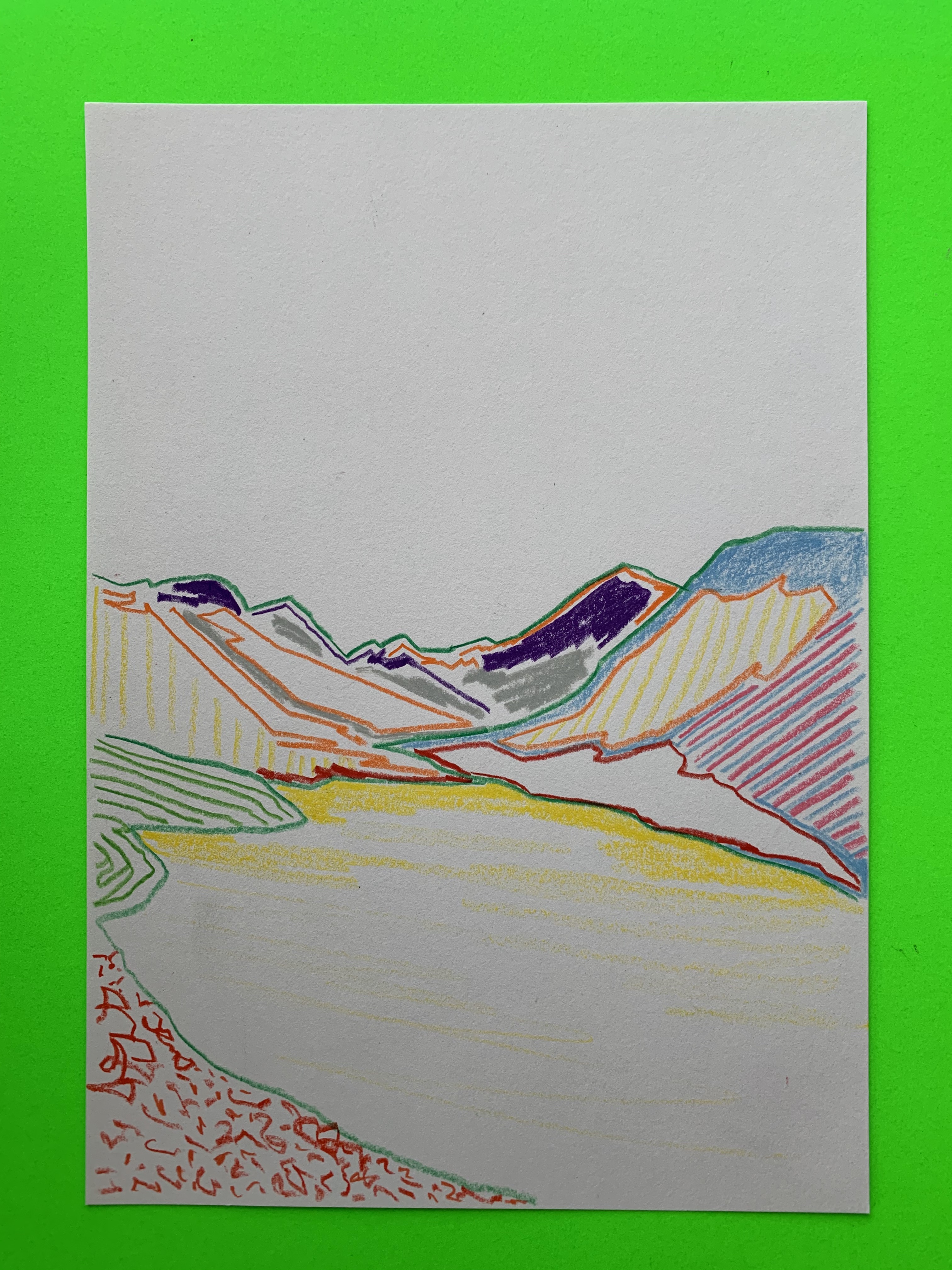 A4 drawings on paper in coloured pencils made whilst on Zoom meetings, workshops and discussions.