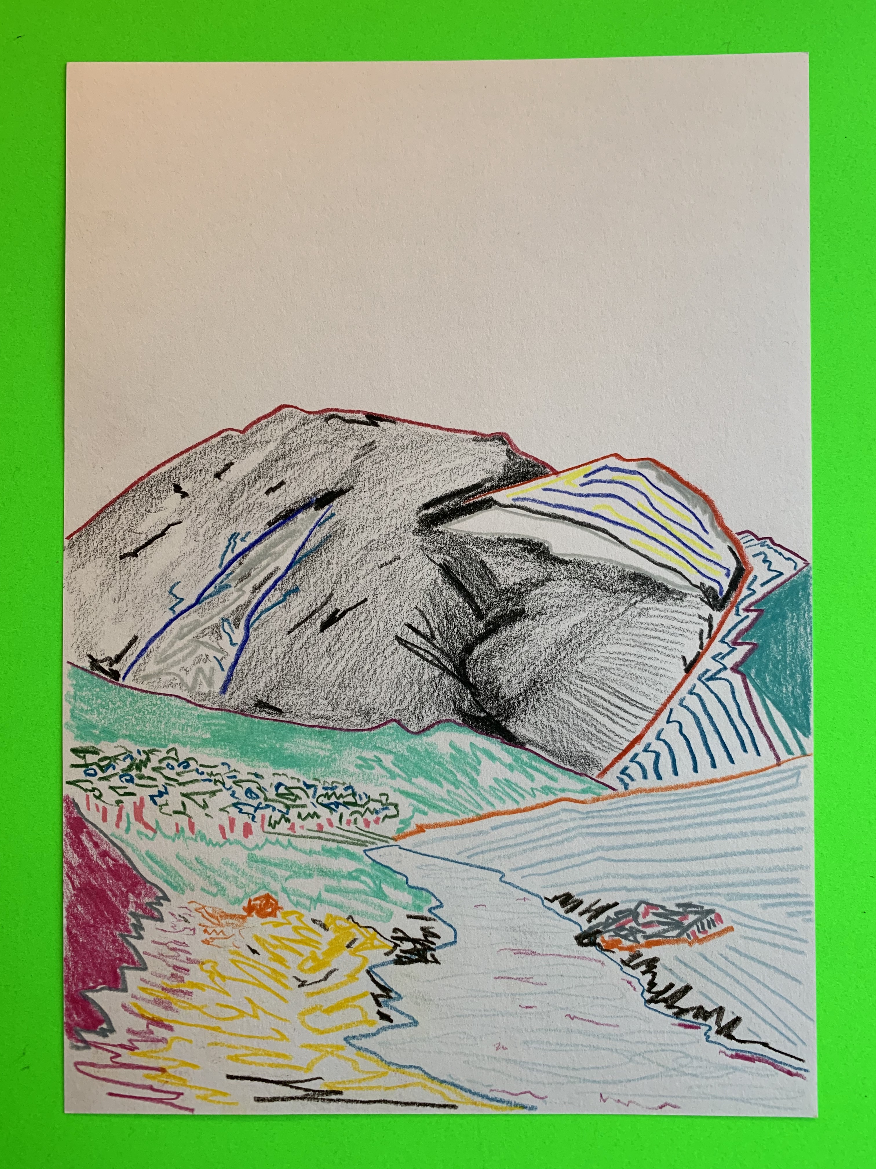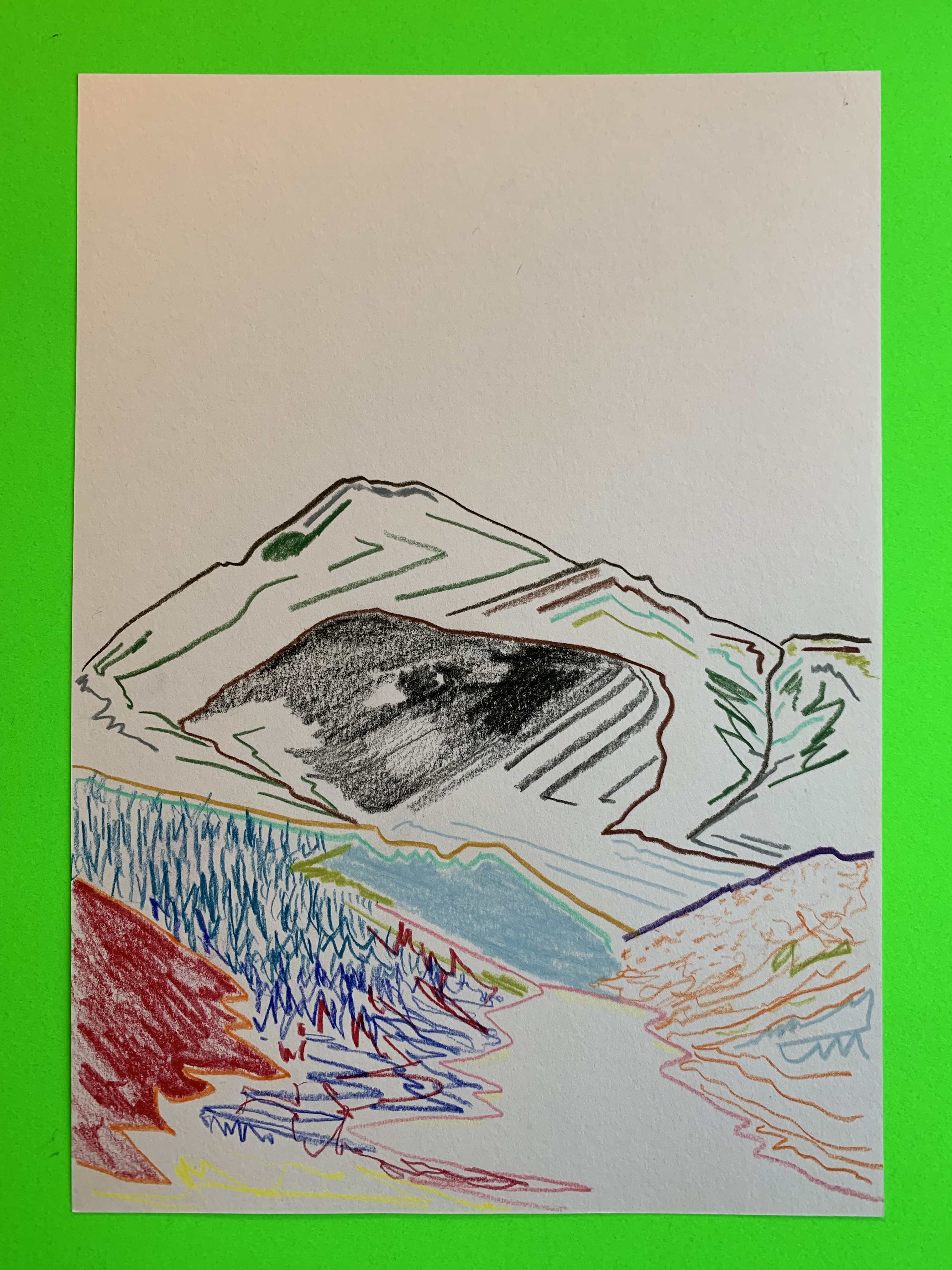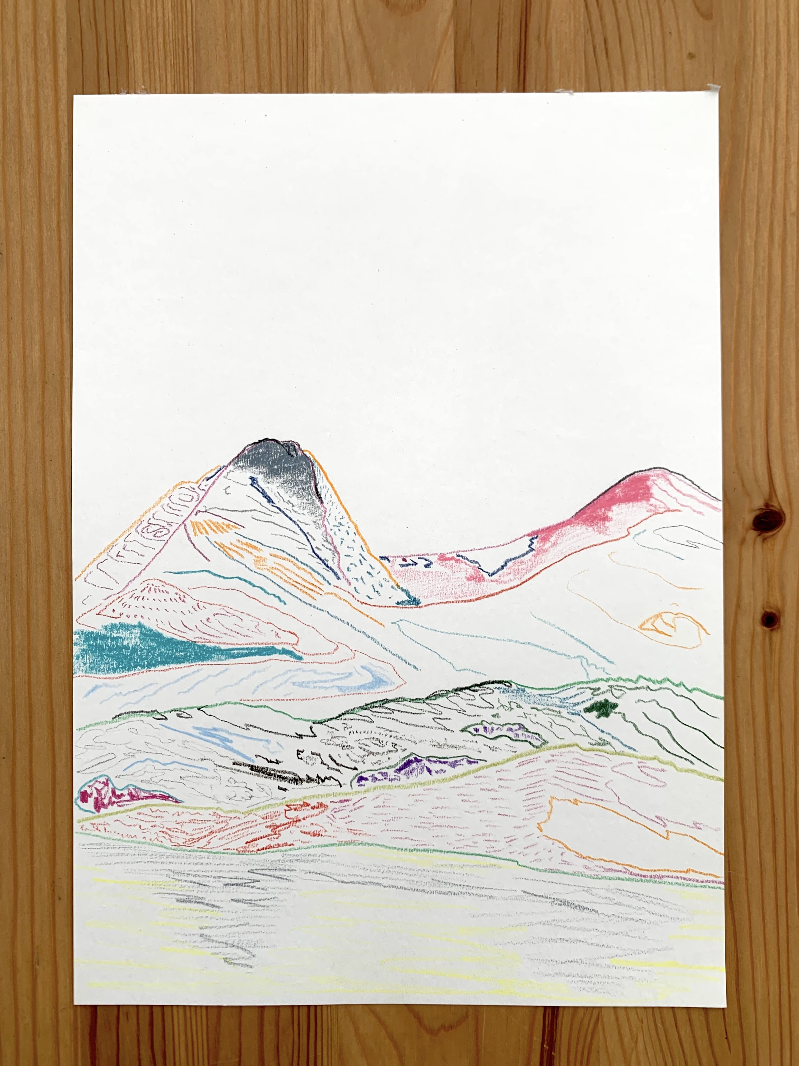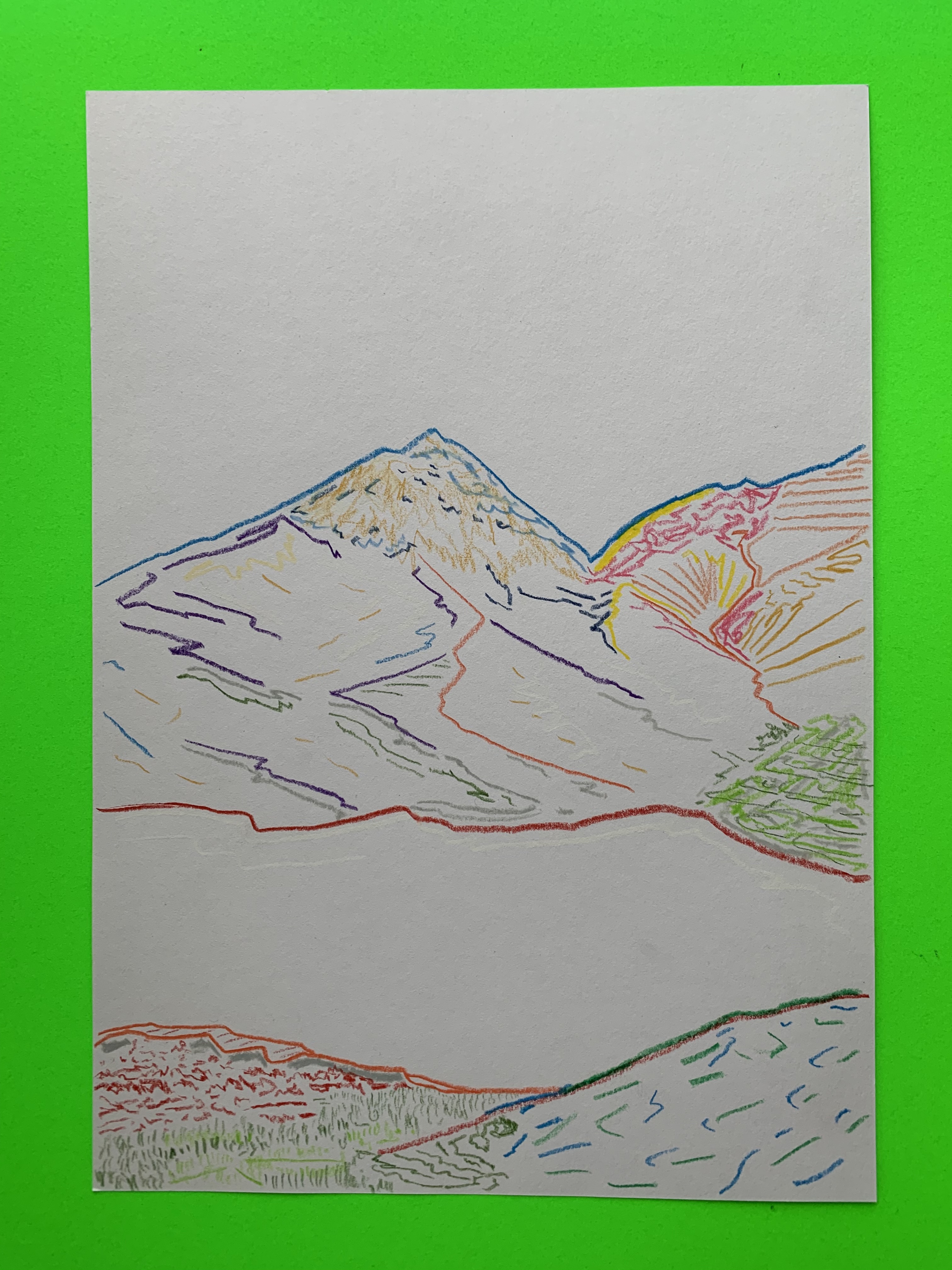A4 drawings on paper in coloured pencils made whilst on Zoom meetings, workshops and discussions.