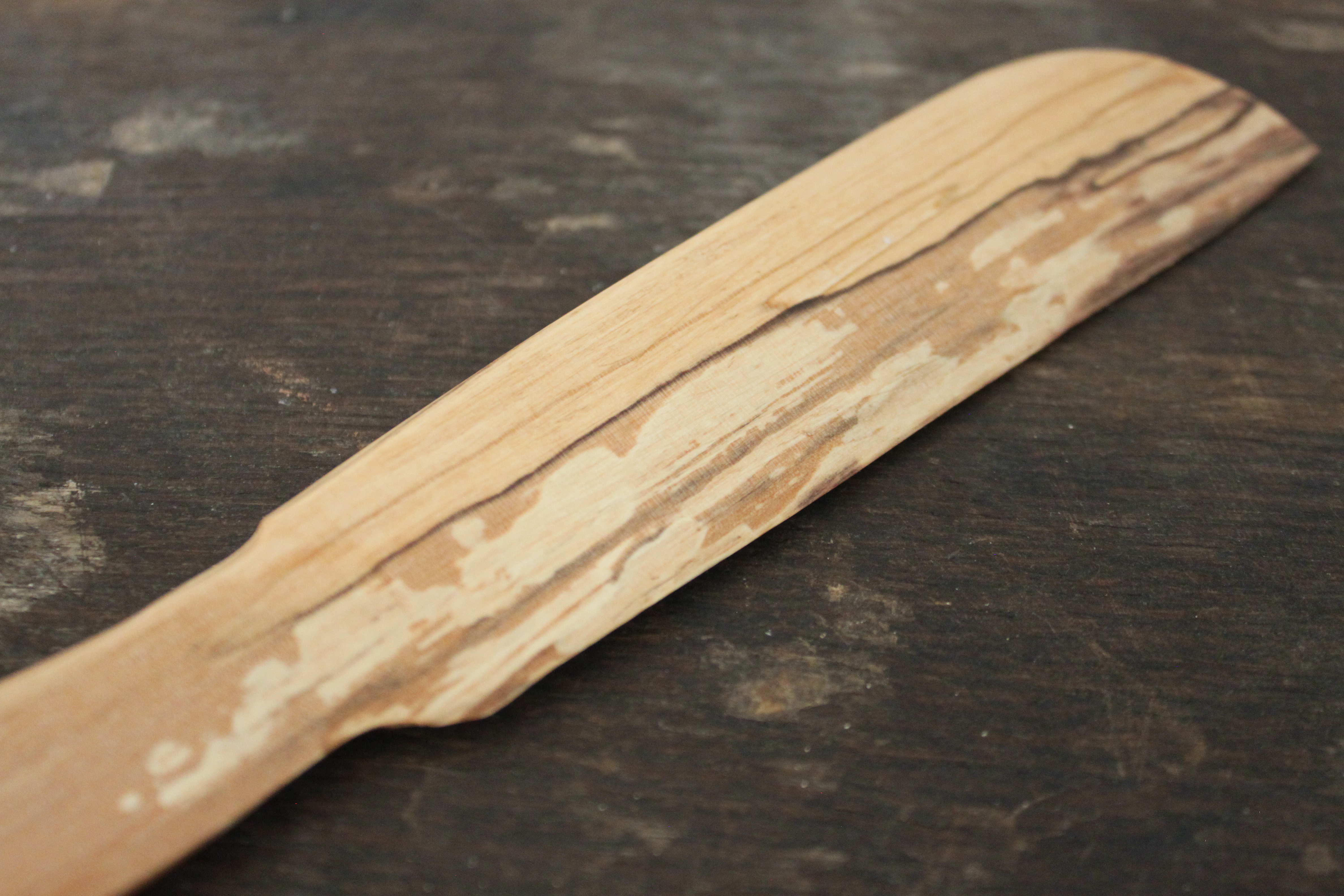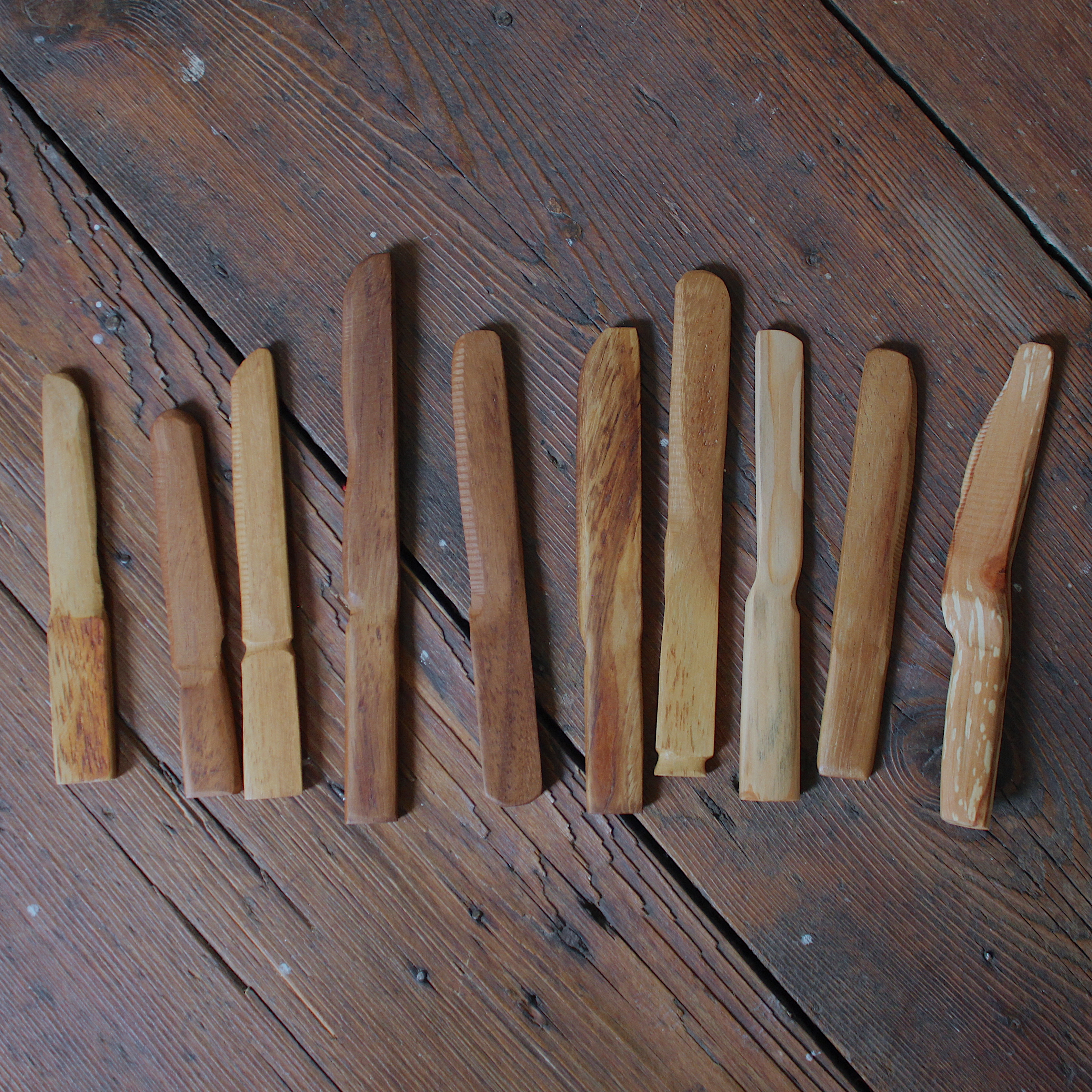 A series of smaller wooden kitchen homeware items, including butter knives, soap dishes and utensils for the shop at Van Gogh House and San Mei Gallery, London.