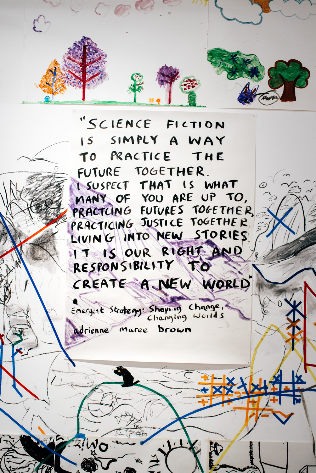 By the end of the project, the studio space was filled with drawing, painting, tape, fabric, poems, a team playlist and other materials created by the students to share their ideas, aspirations and opinions.